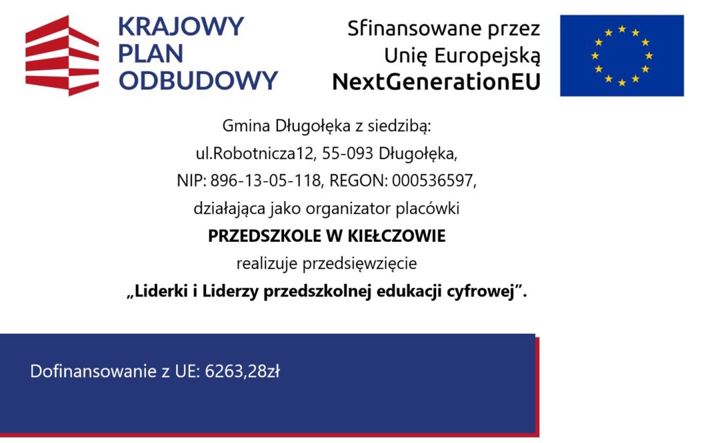 Z przyjemnością informujemy, że nasze Przedszkole w Kiełczowie otrzymało dofinansowanie w ramach przedsięwzięcia finansowanego z Krajowego Planu Odbudowy i Zwiększania Odporności (KPO) ze środków Unii Europejskiej w ramach instrumentu „Next Generation EU” poprzez udział naszych nauczycielek w projekcie pt. „Liderki i Liderzy przedszkolnej edukacji cyfrowej”.